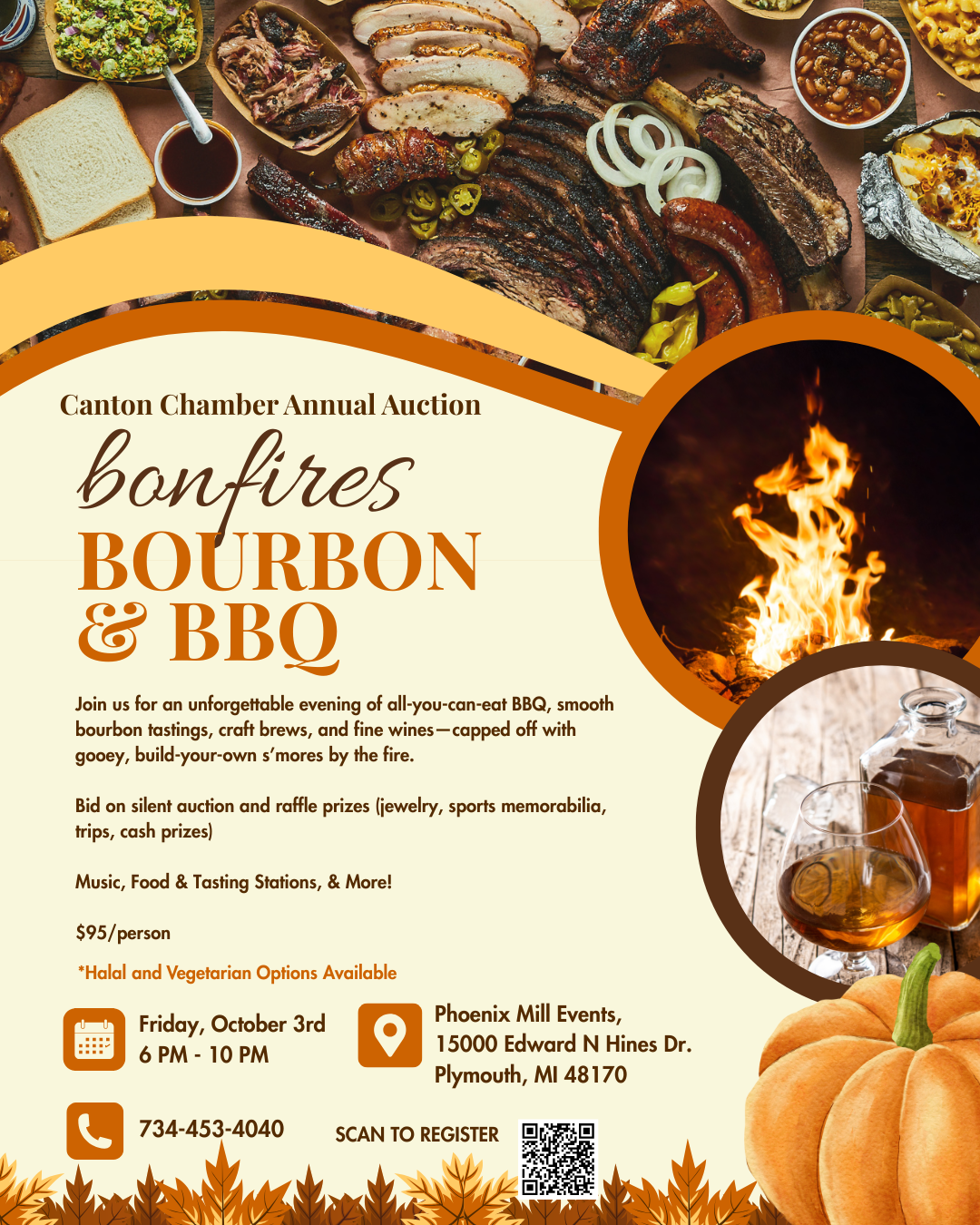 This fall, the Canton Chamber of Commerce is hosting a festive auction paired with a fabulous dinner spread, bourbon, desserts, and more! Join us for a cozy evening filled with smoky flavors, smooth bourbon tastings, craft brews, fine wines, gooey s'mores, and fireside fun at Phoenix Mill Events in Plymouth, Michigan.