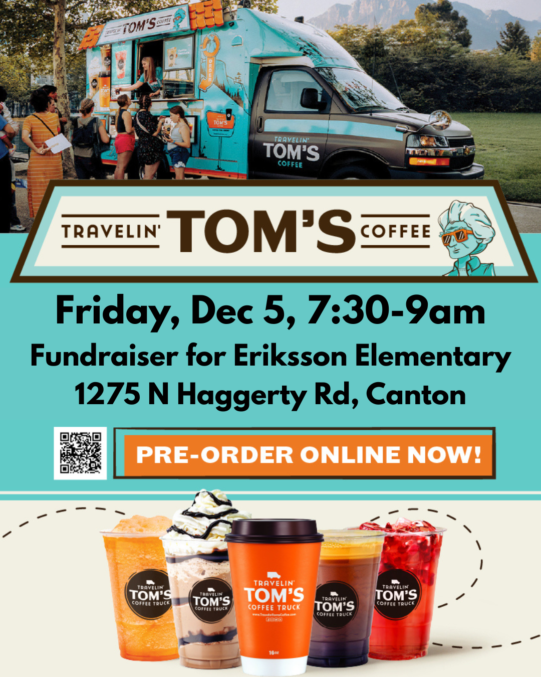 Join us for a fundraising event on Thursday, December 5, from 7:30-9:00 AM. Stop by and purchase your morning coffee or treat from Tom's Coffee Truck – every purchase helps support our school!