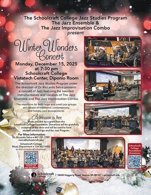 The Schoolcraft Jazz Studies Program, under the direction of Dr. Riccardo Selva, presents a concert of Jazz featuring the talented instrumentalists and vocalists of The Jazz Ensemble and The Jazz Improvisation Combo.