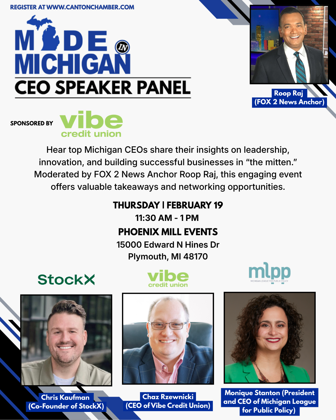 Chaz Rzewnicki (Vibe Credit Union), Laura Huot (The Guidance Center), and Chris Kaufman (StockX), CEOs of Michigan, will be featured (moderated by Roop Raj, FOX 2 News Anchor!)